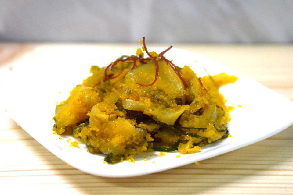 肉厚で歯ごたえのある赤西貝と、プチプチ食感の魚卵を組み合わせた海鮮珍味です。海藻が彩りを添えて、見た目にも食欲をそそります。